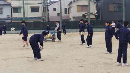 今日の5限、2年生の体育授業は女子がハンドボール、男子がサッカーでした。屋外での男子のサッカーは、まだ気温が低いですが身体を動かす運動にはちょうど良い気候かもしれませんね。先生の指導をシッカリ学び楽しく授業を受けていました。