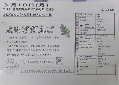 今日のメニューに「よもぎだんご」がついてました。粉末やペーストした生のヨモギを使用しており、お餅に絡んだよもぎの若草色のおだんごは見た目涼やかでお味はさっぱりした甘い香りがたまりません。あんこがはいっていればまた一段とボリューミーになりますね!
