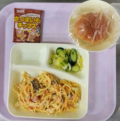 さけのクリームスパゲッテイー キャベツときゅうりのサラダ
