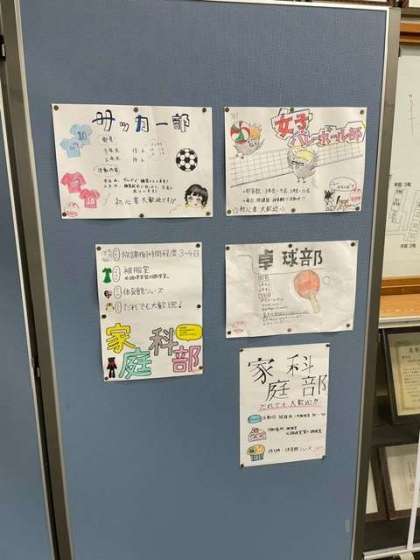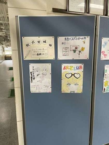 正面玄関には、各部活動が作成した紹介ポスターが掲示されています。