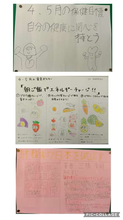 今月の目標やおすすめの図書、食育ポスターなどを委員会や生徒会で作成し、各学年の掲示板に掲示しています。