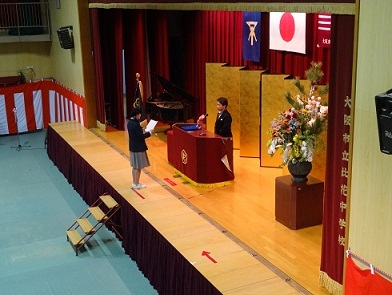 思いの詰まったコサージュを胸に、晴れやかな表情で入場する大阪市立此花中学校51期生。