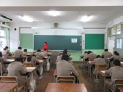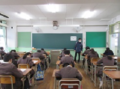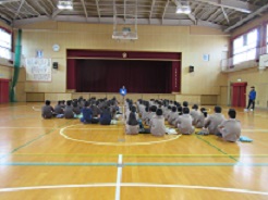 体育館で中学校での授業前後の挨拶の説明を聞いた後、