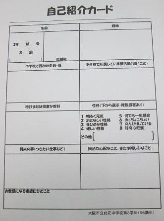 今日の6時間目は民泊でお邪魔する方への自己紹介カードを書きました。
