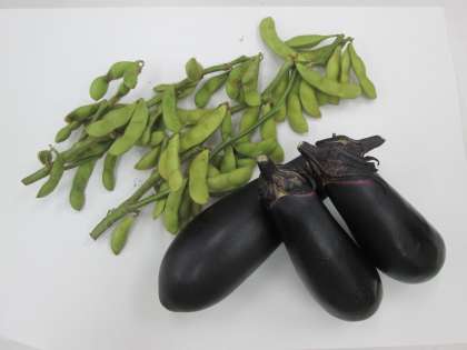 夏野菜の代表「なすび」と、たくさんの実をつけた「枝豆」。