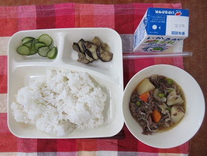・肉じゃが、焼きなすのみそだれかけ、あっさりきゅうり