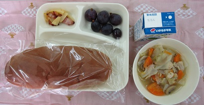 ・鶏肉とてぼ豆のスープ煮、じゃがいもとトマトのチーズ焼き、ぶどう