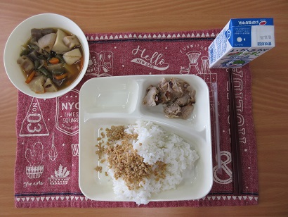 ・豚肉のねぎじょうゆ焼き、ふきよせ煮、ツナ大豆そぼろ