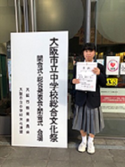 10月20日(土)に住吉区民センターにて、大阪市立中学校総合文化祭の代表生徒表彰式が行われました。ポスター原画コンクールに入選した本校の美術部1年生が、美術部の代表として表彰されました。入選された作品を含め、大阪市の各中学校の美術部の作品は10月28日(日)まで、花博記念公園内の咲くやこの花館に展示されています。