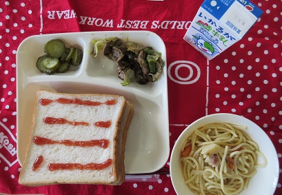・牛肉のカレー風味焼き、トマトのスープスパゲッティ、きゅうりのサラダ