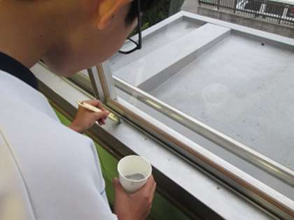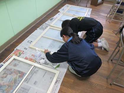 写真は1年生の様子です。1年生は、ペンキで教室の窓枠と窓の桟の塗装を行いました。