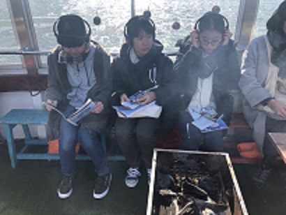 ヘッドホンを付け、アーティストの方々とともに船に乗り
