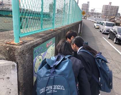 森巣橋で「此花おもしろトレイルルート」の看板を確認しています。