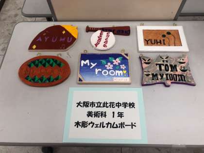 今年度最後の展示は、美術科1年の「木彫ウェルカムボード」です。
