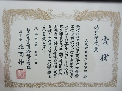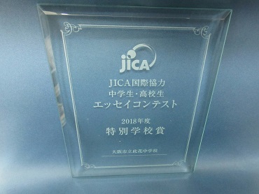 3月4日(月) JICAエッセイコンテスト2018 公開日 2019/03/04 更新日 2019/03/04 お知らせ 「JICA国際協力中学生・高校生エッセイコンテスト2018」に応募した記念品が、本日各クラスで配布されました。 今年度は、毎年学校賞を受賞してきた結果として、 此花中学校に特別学校賞が贈られました。 在校生はもちろん、卒業生の努力の結晶が、 またひとつピロティに加わりました。 今後も視野を広げ、日々の学習に励んでいきましょう。 いいね(0)