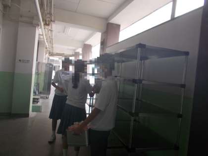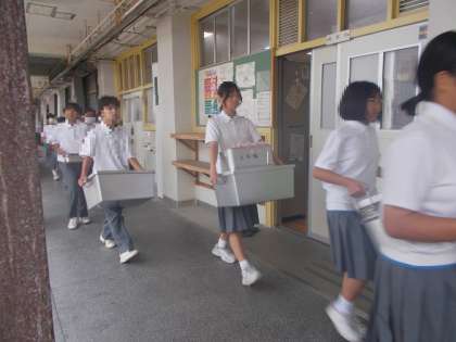 給食室に食器類を持っていく生徒達の中で、竹取物語の話を楽しそうに友達同士で話していました。