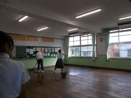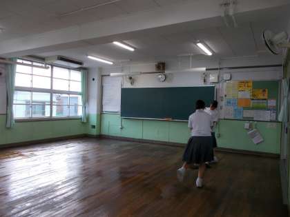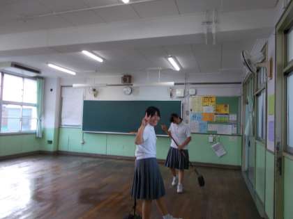 先週の金曜日の放課後、3年生の美化委員の生徒が塗油を床に塗ってくれています。