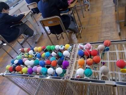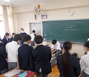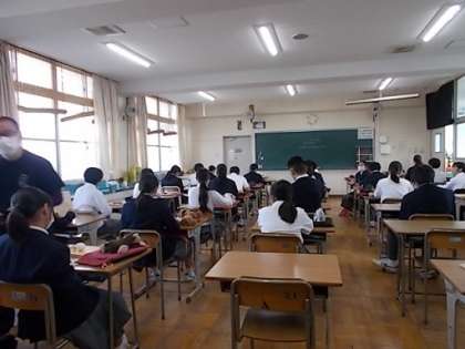 1年美術の授業です。けん玉作成が終わり、陶芸をしています。陶芸をしている生徒の周りを囲み、先生も生徒も和やかで様子で完成が楽しみです。