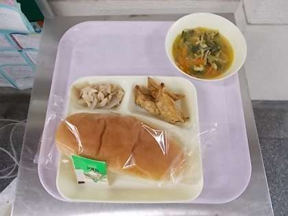 今日の給食は、コッペパン、牛乳、揚げ餃子、中華みそスープ、れんこんの中華だれかけ、ソフトマーガリンです。