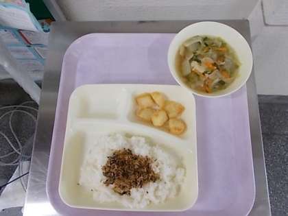 今日の給食は、ご飯、牛乳、いか天ぷら、五目汁、おかか菜っ葉です。