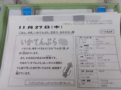 「いか」には体を作る元になるタンパク質が多く含まれています。また、噛み応えがあるのが特徴です。今日のいか天ぷらは、いかに小麦粉とでん粉で作った衣がついたものを、給食室で揚げています。