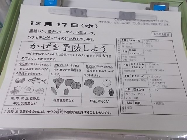 1群:タンパク質2群:カルシウム3群:ビタミンA4群:ビタミンC5群:炭水化物6群:脂質が今日の給食には全て含まれています。