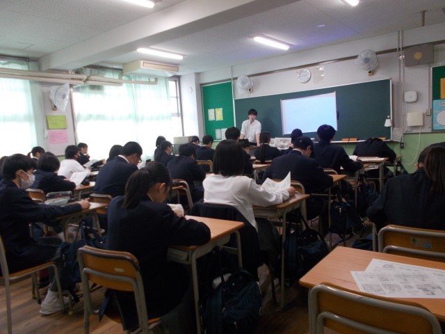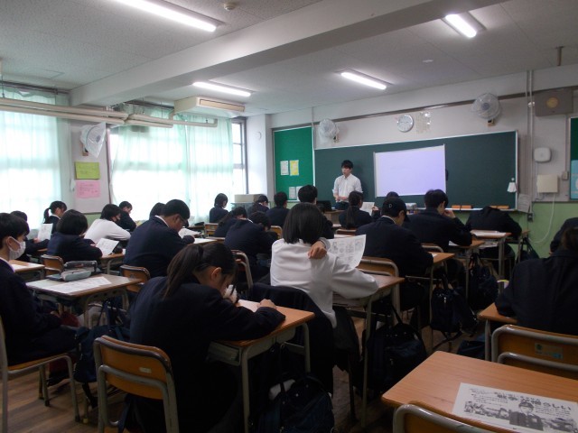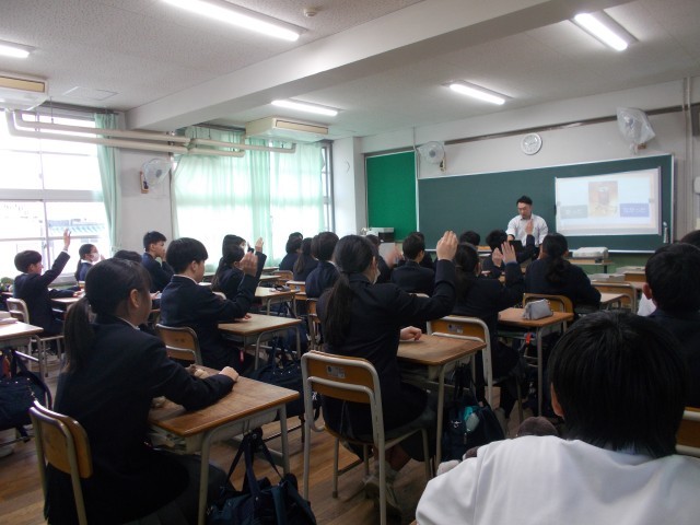 プロジェクター画面に古い機械が映し出されて、昔の掃除機や蓄音機、テレビなどは戦前から存在していたのか、戦後から存在したものなのかとクイズ形式で先生が発問し、生徒たちが挙手をしたり、先生にあてられて答えたりしています。
