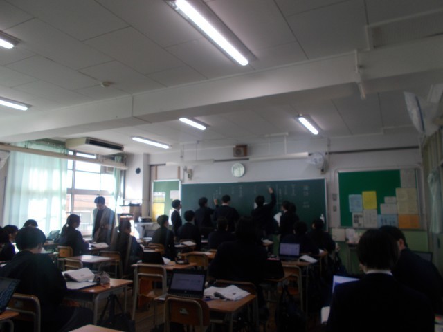 論語とは孔子と弟子たちとの問答を集録した書物です。ワークシートの問題を生徒達で話し合って記入しています。制限時間が来ると先生は、黒板に答えを記入してもらおうと思うので挙手してくださいと伝えると、生徒たちは積極的に挙手をして6名の候補者が決まり黒板に答えを書いてくれています。生徒たちの記入が終わると、先生が添削してくれます。
