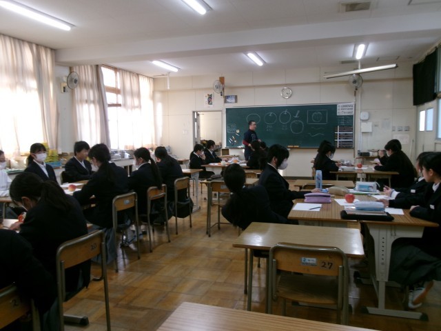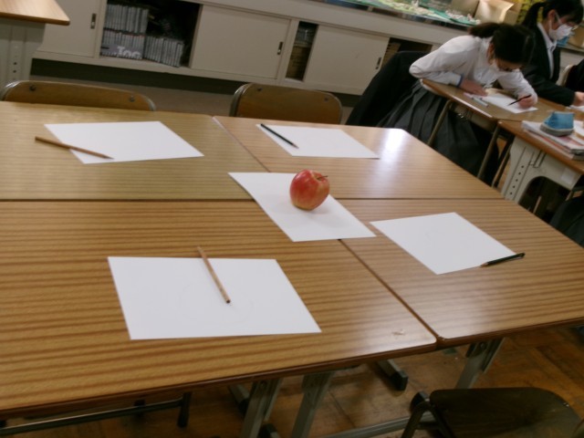 美術部はりんごの模写のデッサンをしています。先生が黒板で立体的なりんごの描き方の説明をしながら絵を書いていくと、単調に描かれた線が立体的なりんごの絵に変化していきました。