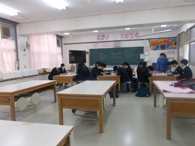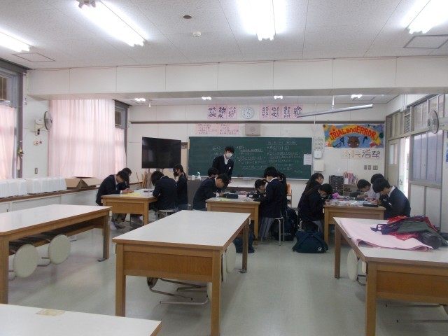 保健委員会は、特別教室の机を運び出したあと、被服室で「ポイ捨て禁止」を呼びかける明るいポスターづくりを行っています。