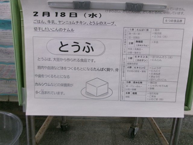 今日の給食は、ご飯、牛乳、ヤンニョムチキン、とうふのスープ、切り干し大根のナムルです。
