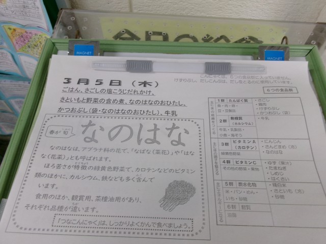 今日の給食は、ご飯、さごしの塩麹だれかけ、さといもと野菜の含め煮、菜の花のお浸し、かつお節(袋、菜の花のお浸し)、牛乳です。
