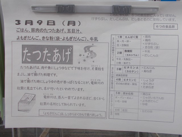 今日の給食は、ご飯、豚肉の竜田揚げ、五目汁、よもぎだんご、きな粉(袋・よもぎだんご)、牛乳です。