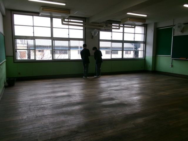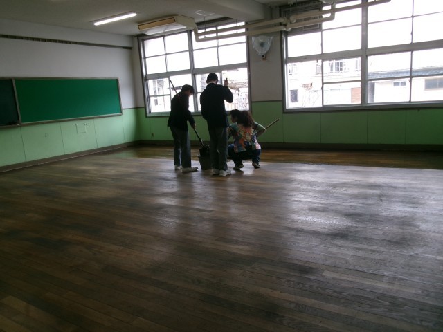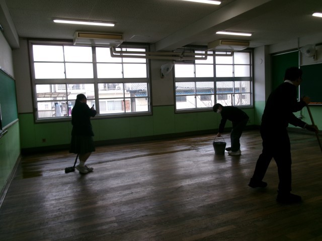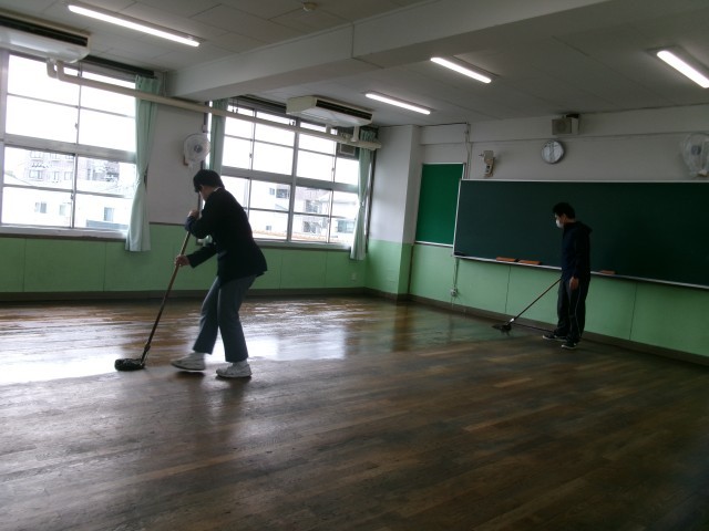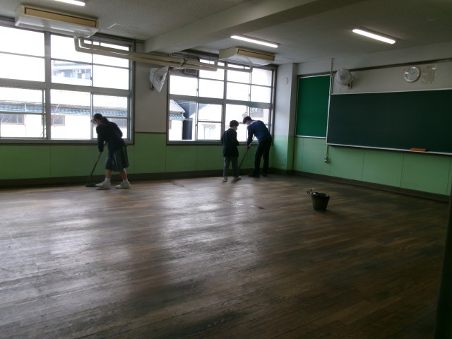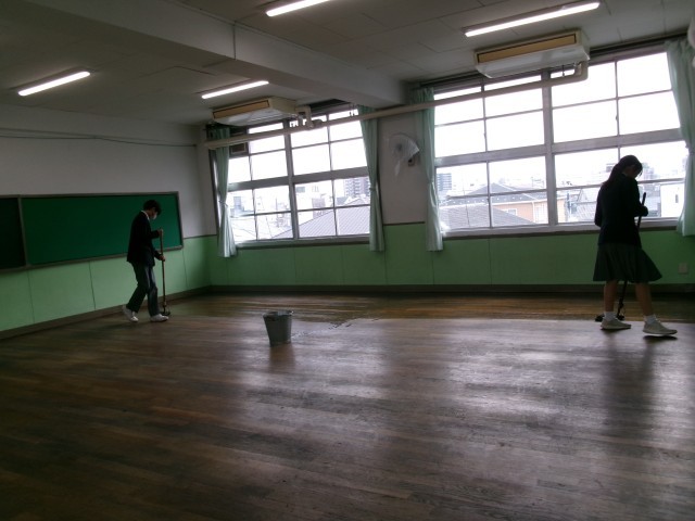 美化委員が教室の床に塗油をしてくれています。