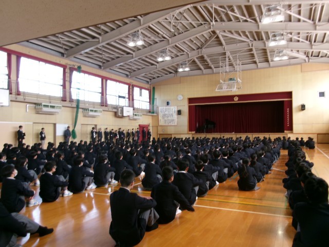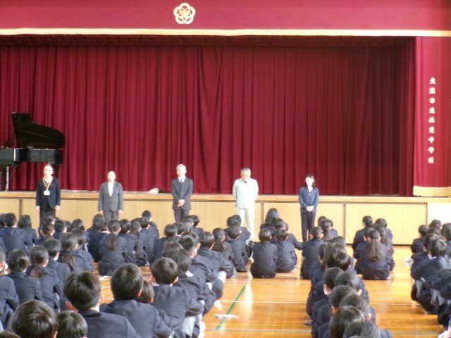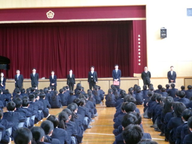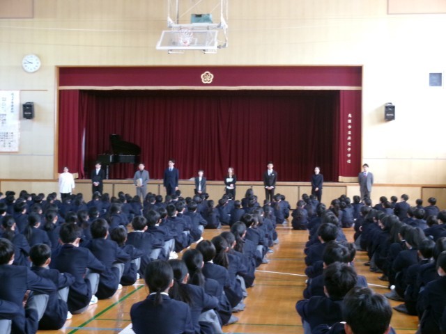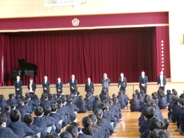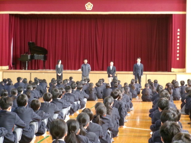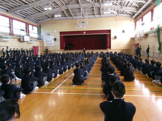 始業式 公開日 2026/04/08 更新日 2026/04/08 学校行事 本日第1学期始業式が行われました。校歌斉唱から始まり、学校長講話(挨拶の大切さ、自分を守り、人を守る大切さ、ルールとマナーを守る大切さのお話し)、教職員紹介、指導主事講話(新学期に元気な姿を見れた喜び、1年生は一歩一歩少しずつ進みながら2、3年生のような動きが出来るように心掛ける大切さのお話し)の流れで進んでいき、最後は生徒会主催の対面式です。 +7 いいね(0)