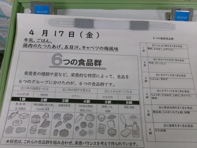 今日の給食は、牛乳、ご飯、鶏肉の竜田揚げ、五目汁、キャベツの梅風味です。
