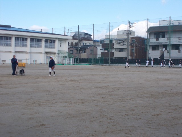 野球部はコーチがノック練習をしています。コーチも生徒も寒さに負けない大きな声で練...