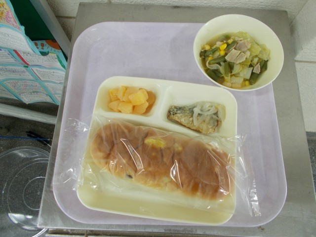 今日の給食は、おさつパン、牛乳、あじのレモンマリネ、てぼ豆のスープ煮、白桃(カッ...