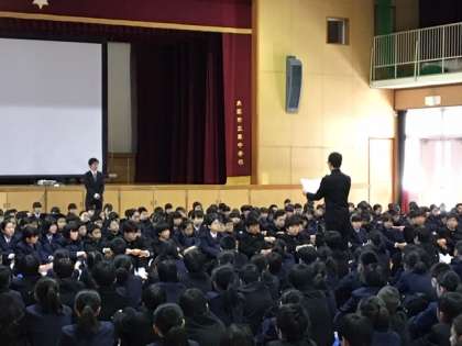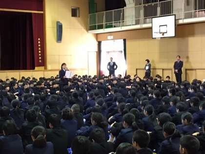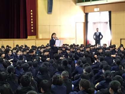今日は初めて3学年が揃う集会です。1年生と2・3年生の対面式がありました。まず、先輩方の代表から挨拶があり、続いて1年生の代表からよろこびの言葉がありました。先輩方、これからよろしくお願いします!