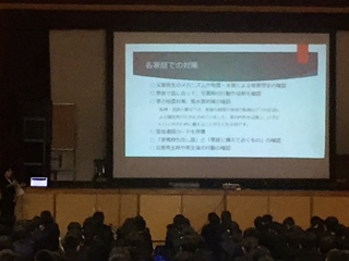 各ご家庭での備えについてのお話もありました。また、学校で行われる避難訓練には、災害に対しての大切な訓練であると 意識を持って取り組みましょうとお話もありました。