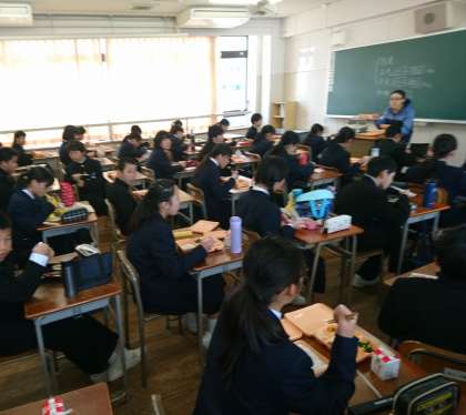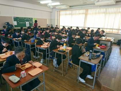 昼食の様子です。給食を注文している生徒たちは、各自で廊下に給食を取りに行きます。