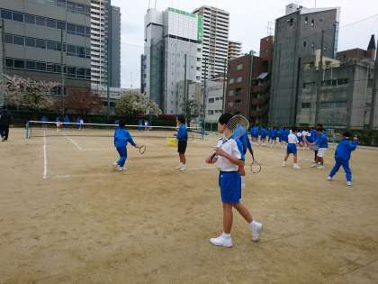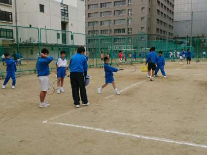 昨日は生憎の雨でしたが、本日はコートを広く使って体験できています。先輩たちも、1年生に優しく教えています。たくさんの笑顔が見られます!