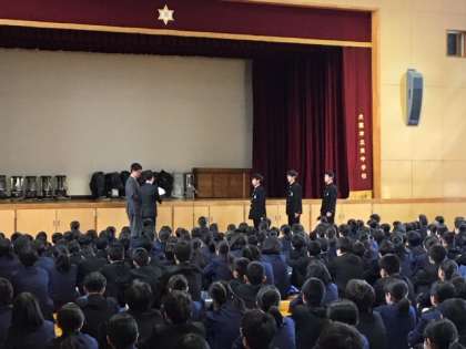 学級役員の代表の皆さんに認症状を授与しました。委員全員の皆さんには担任の先生からクラスで授与してもらいます。今回、委員に選ばれた皆さんは積極的に立候補してくれたと聞いています。大変喜ばしいことです。どんなことでも責任をもって何かの仕事をするということは、大変なことだと思います。しかし、誰かがその役をやらなければならないのであれば、進んでやる気持ちを持ってほしいと思います。学級役員になった皆さんは、東中のため、自分の学年・クラスのために、頑張ってください。そして、その一方で、役員を選んだ周りの皆さんは、役員になった人に大変な仕事を任せきりにするのではなく、選んだ側にも責任があります。この東中をよくしていくためには、むしろ学級委員にならなかった人が、どんな行動をとることが大切なのか。しっかりと考えてほしいです。役員としての「自覚と責任」、そして選んだ人の「自覚と責任」それぞれがかみ合って初めて、皆さんによる自治(自分や自分たちに関することを自らの責任において処理すること)が成立するのです。東中生による東中生のための東中づくりを進めていきましょう!