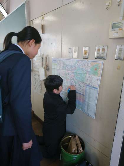 家庭訪問にむけて、自分の家を地図にチェックしている生徒もいました!