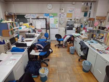 本日5限、南海沖を震源とする大規模地震が発生、余震及び火災等、二次災害が発生する危険があることを想定し、さらに、放送設備が使えない状況をも想定し避難訓練を実施しました。