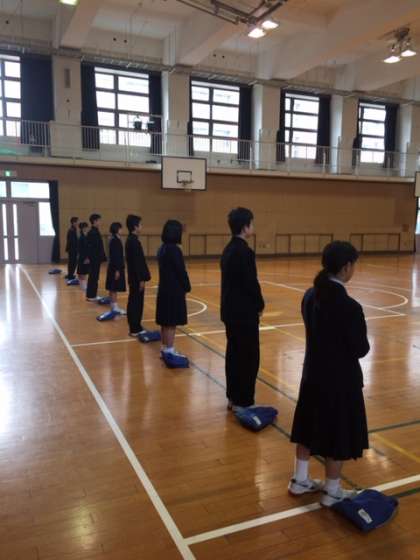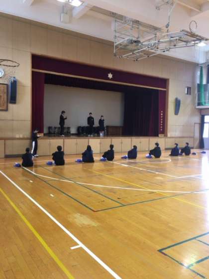 朝7時半から各クラスの学級代表が集まり、今日の学年集会の練習をしています。