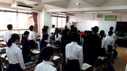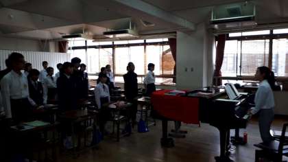 音楽科の授業では、発声練習の後、校歌の練習をしています。