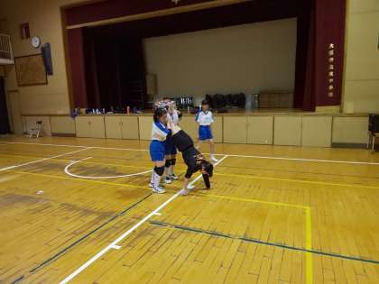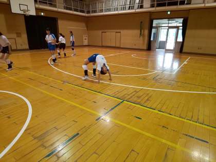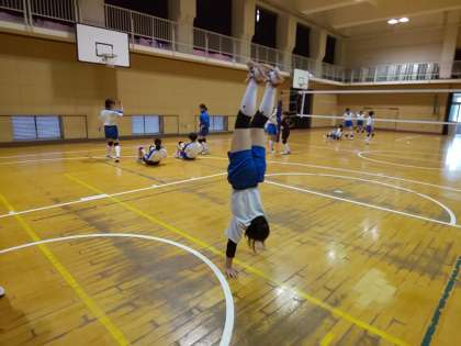 家庭訪問中の放課後、体育館ではバレーボール部が練習前半のトレーニングを行っています。