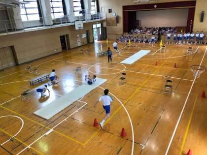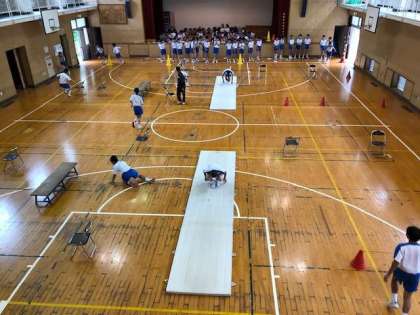 3年生1・2組の体育の授業では、体つくり運動に取り組んでいます。今日は「動きを持続する能力を高める運動」で体育館全面に器具を設置してサーキットトレーニングに挑戦しています。サーキットトレーニングを1周終えれば息が上がるようなトレーニング内容になっています。様々なトレーニングを経験して、自らの体力(柔軟性、パワー、スピード、巧緻性、持久力)などを知り、それを補いながら生涯にわたり運動に慣れ親しむことが目的です!頑張れ3年生!