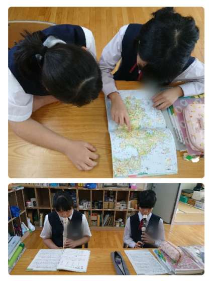 「1年生は一泊移住で奈良県に行くんやって。」「3年生の修学旅行は九州やんな?」と地図帳を一緒に開いています。